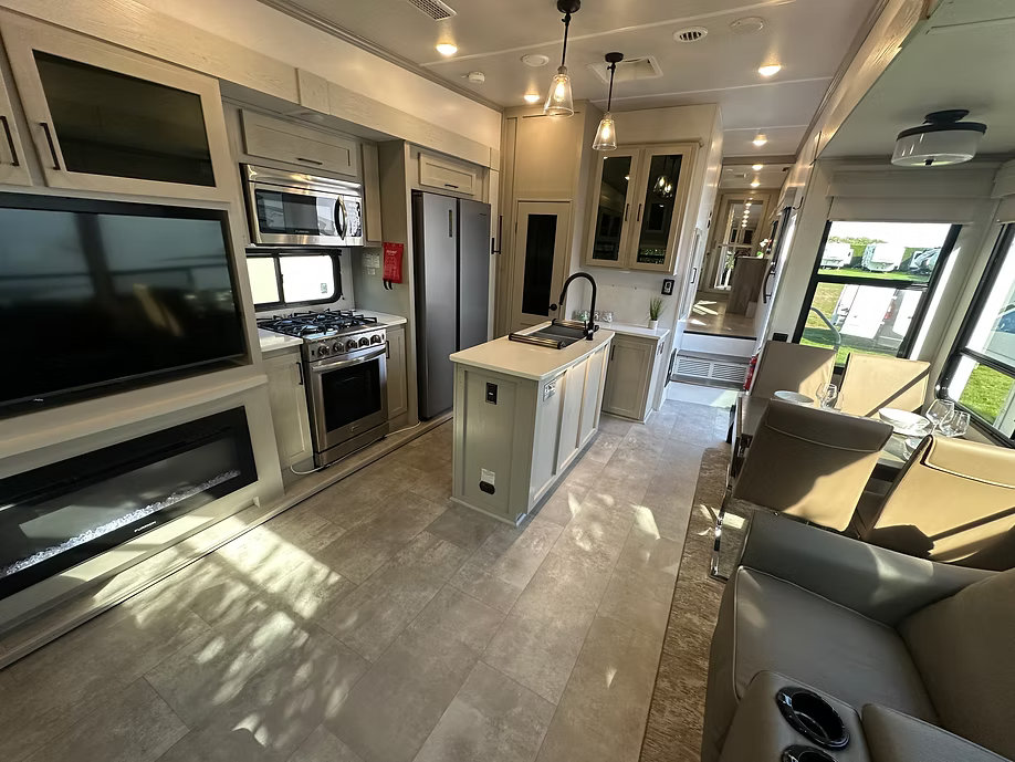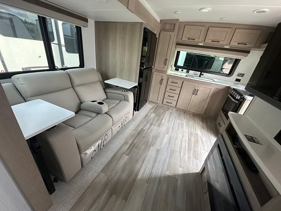 The living area is the heart of the unit - and it feels like it. Large tinted windows flood the space with light, while reclining theatre seating, a generous TV and entertainment setup, and an electric log-effect fire make it genuinely comfortable to spend time in. A sleeper sofa and dining area with seating for four round out the space.