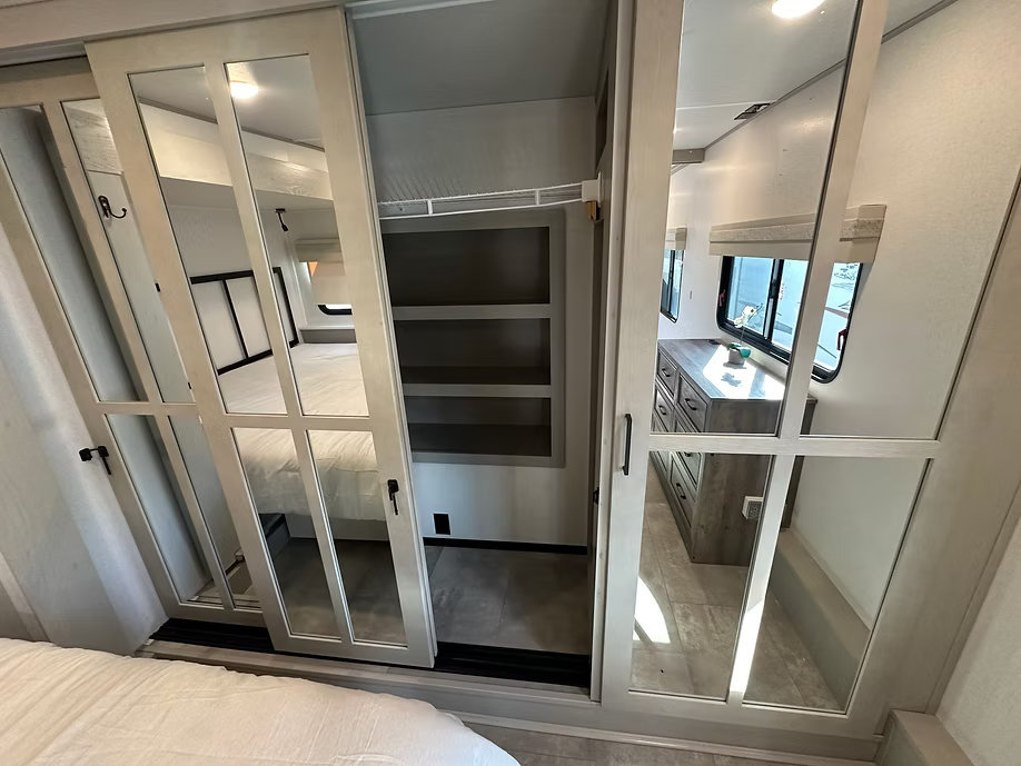 The bedroom slide-out creates a genuinely spacious room - enough for a UK king size bed with room to move around it comfortably. Wardrobes, overhead storage, bedside outlets and the option for a bedroom TV make it feel more like a hotel room than any caravan you've stayed in before.